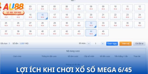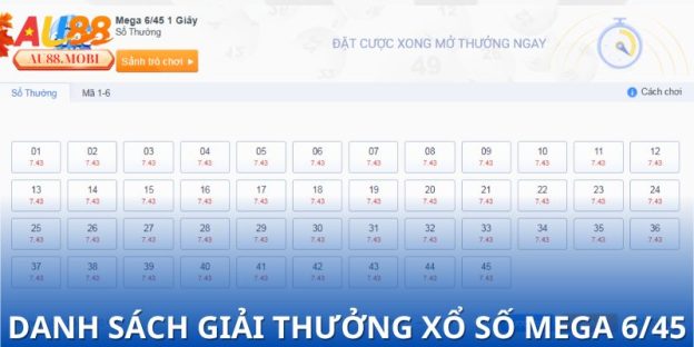 Xổ số Mega 6/45 là gì mà lại khiến nhiều người bàn tán và tham gia mỗi ngày? Đây là loại hình xổ số tự chọn do Vietlott phát hành, mang đến cho người chơi cơ hội trúng thưởng cực lớn chỉ từ những con số giản đơn. Ngay sau đây, hãy cùng tôi tìm hiểu chi tiết về cách chơi, cơ cấu giải thưởng và cách chơi Mega 6/45 trên AU88.